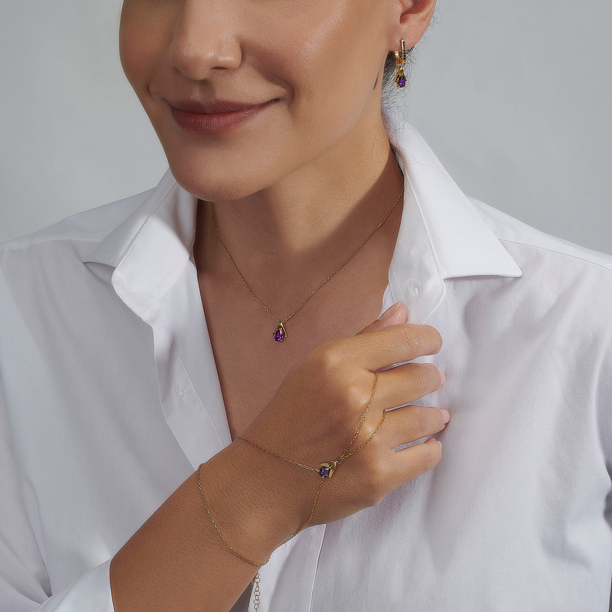 Designed to switch moods, delicate hoops studded with black stones, paired with a rich amethyst-toned charm. Day to night, subtle to standout.